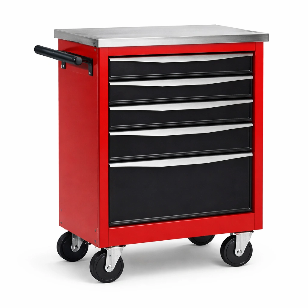 Carro de herramientas de acero con cajones en rojo y negro